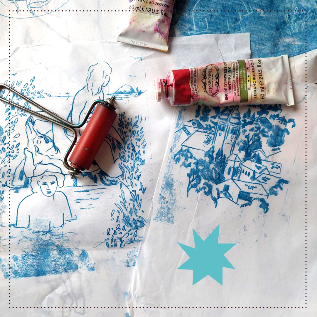 C’est un procédé d’impression sans gravure et à tirage unique. On peint sur un support lisse comme du verre, métal ou Plexiglas, et on vient ensuite apposer une feuille que l’on presse manuellement pour faire le transfert de l’œuvre !